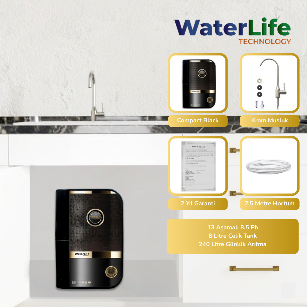 Waterlife Compact Black, zarif ve modern çizgileriyle mutfaklara sade bir şıklık katarken, kompakt gövdesiyle dar alanlarda bile güçlü bir performans sunan su arıtma cihazıdır. Ev kullanıcıları için tasarlanan bu model, 13 aşamalı gelişmiş filtreleme sistemi sayesinde içme suyunu her zaman taze, güvenli ve keyifle içilebilir hale getirir.