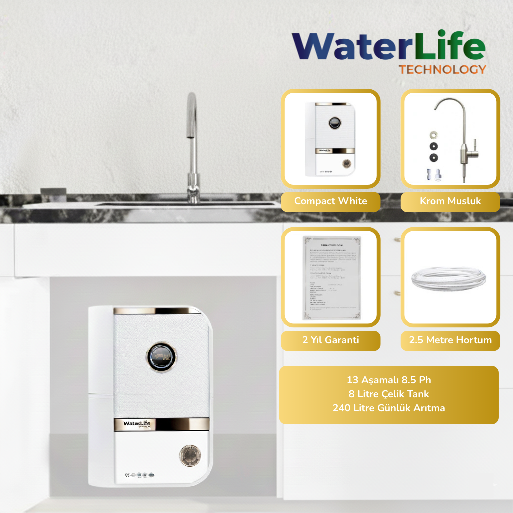 2 yıl resmi üretici garantisi, Parça değişimlerinde sunulan hızlı servis desteği sayesinde Waterlife Compact White, uzun ömürlü ve sorunsuz bir kullanım deneyimi sunar. Sessiz çalışma teknolojisi, kolay filtre değişim sistemi ve gıda sınıfı hijyenik malzeme yapısıyla hem konforu hem güveni bir arada arayanlar için güçlü bir tercihtir.