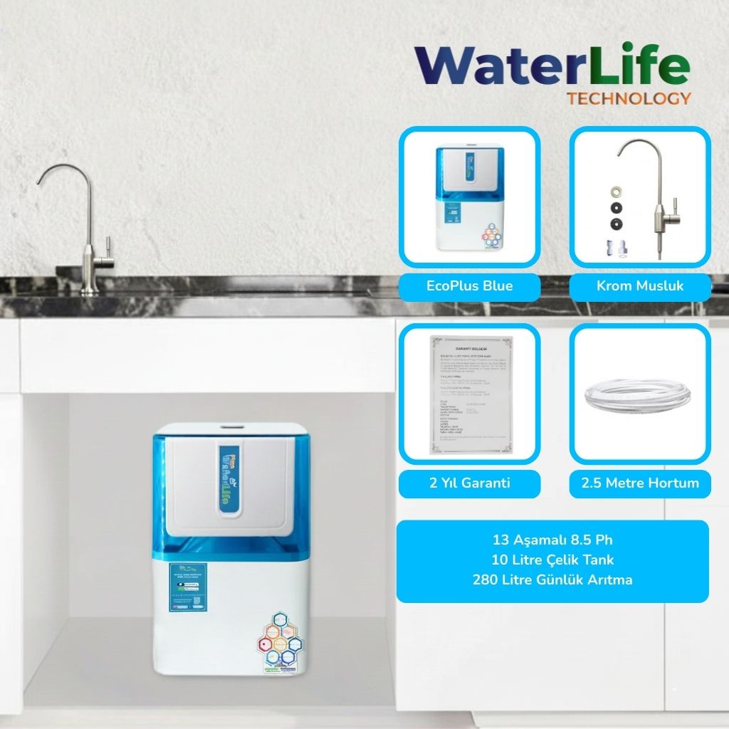 Waterlife EcoPlus Blue, 6 aşamalı gelişmiş filtrasyon sistemine sahiptir. İlk aşamada tortu filtresi kum, pas ve çamur gibi büyük partikülleri süzer. Granül aktif karbon filtresi klor, kötü koku ve tatları giderir. Blok karbon filtre ince tortuları arıtarak suyun berraklığını ve tadını iyileştirir. RO membran filtre bakteri, virüs, ağır metal ve kimyasal maddeleri %99 oranında arıtır. Tatlandırıcı karbon filtre arıtılmış suya daha yumuşak ve ferah bir içim kazandırır. Mineral filtre ise suyu alkali minerallerle zenginleştirerek sağlıklı içim sağlar.